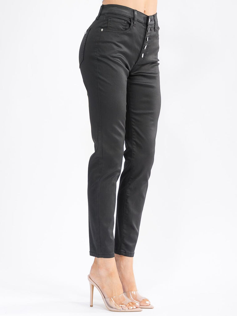 The high-rise waist design defines the waistline and elongates the legs, while the fitted silhouette flatters your figure for a sculpted, confident look. The button-front detail adds a trendy metallic accent, giving a polished and edgy vibe.