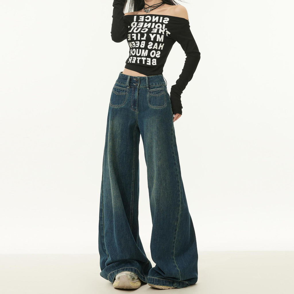 Women’s High-Waist Wide-Leg Jeans – Dark Blue Vintage Loose Fit Denim Trousers