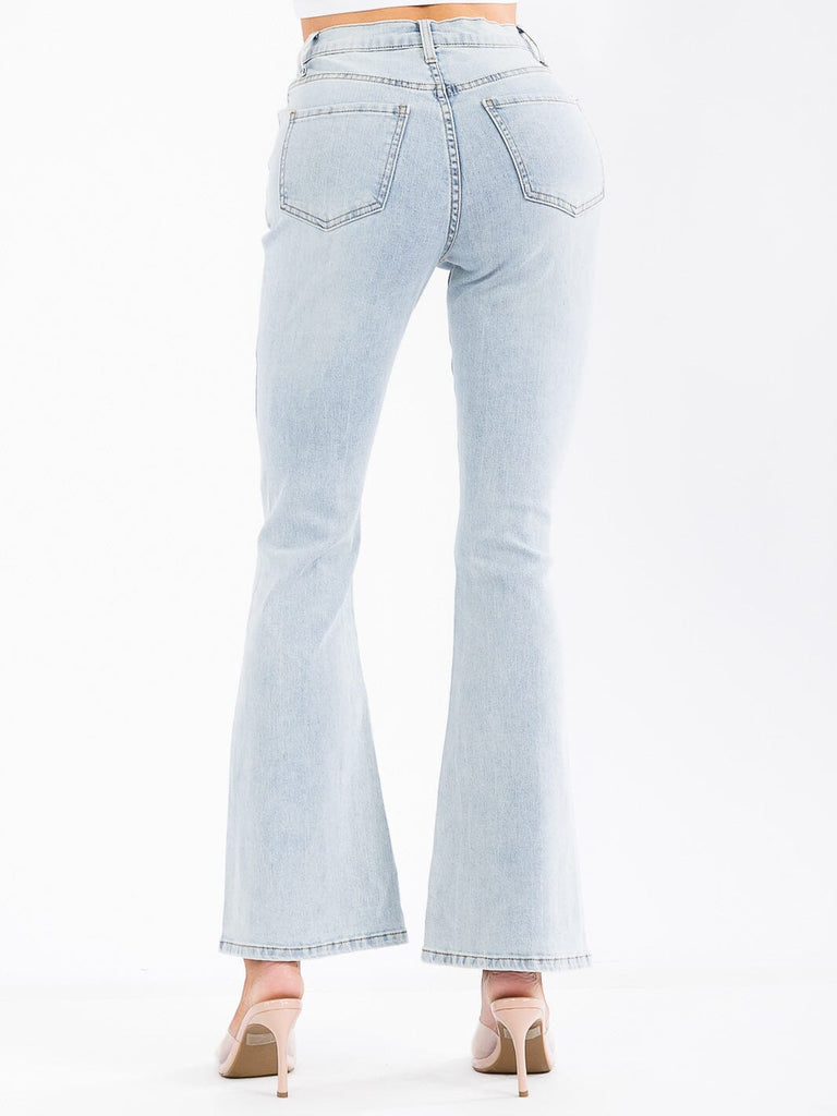 WOMEN'S BUTTON CLOSURE DISTRESS WASHED BELL LEG DENIM PANTS